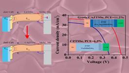 在绿色无毒的Cu2ZnSn(S,Se)4薄膜太阳能电池中,由于Cu和Zn的离子半径和化学性质非常相似,内部高浓度的CuZn反位缺陷造成p-n结界面处的费米能级钉扎和体相中载流子复合,导致Voc降低,成为限制CZTSSe器件性能提升的关键因素。武老师课题组设计了“V”型Ag梯度(Cu1-xAgx)2ZnSn(S,Se)4吸收层,在Mo/CAZTSSe界面加强了对长波长入射光的利用并降低复合;在吸收层体相中最大限度地降低CuZn反位缺陷的浓度,保证了良好的电导性;在CdS/CAZTSSe界面处减弱费米能级的“钉扎”效应,有效的增强了由p型向n型的转化,最终得到了11.2%的电池效率。该研究成果是目前国际上CAZTSSe体系的最高效率,对未来高效铜锌锡硫硒薄膜太阳能电池的探索及理论研究具有一定的指导意义。