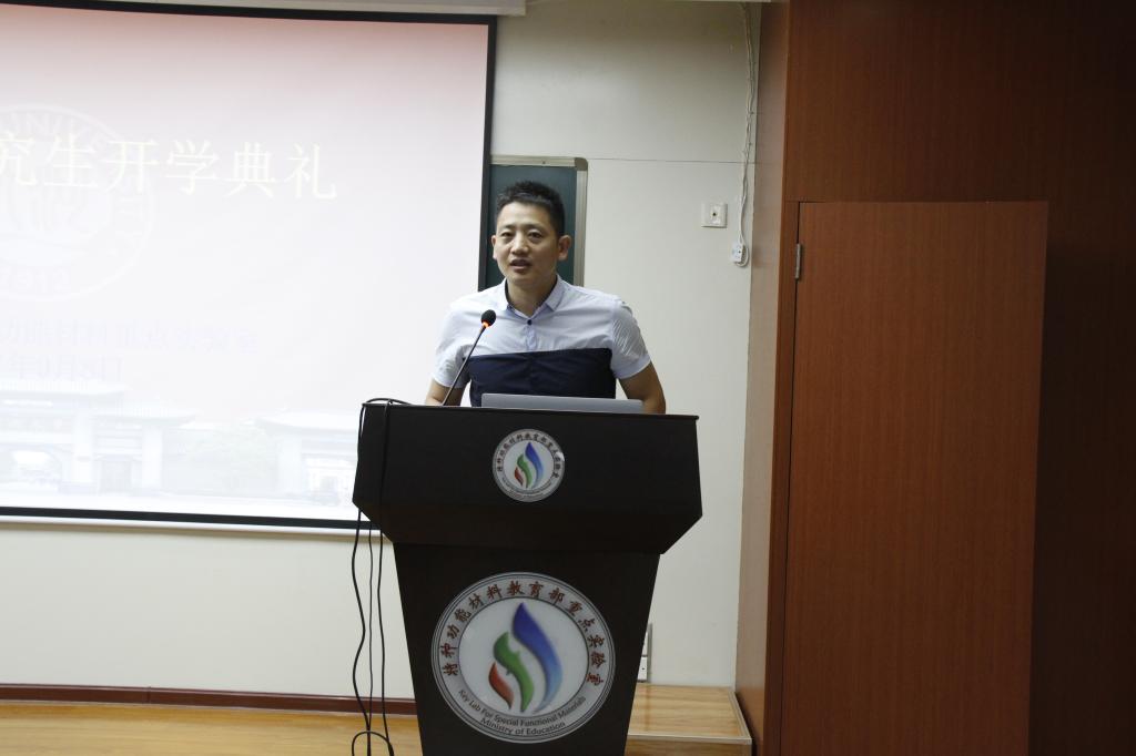 教师代表王书杰向新生的到来表示热烈欢迎。他就研究生的学习和科研生活提出了自己的看法:第一,转变角色、树立人生目标。要把读研究生当做一份事业,一份工作来看待,这样的话,大家的责任心、事业心、担当精神就能随着角色的转变迅速融入到科研生活中来。人生目标是一个人努力奋斗的方向,只有树立目标,才有动力和努力的方向。第二,保证学习时间,努力阅读文献。研究生的学习和工作需要大量的时间来作为保证,天道酬勤,没有长时间在实验室奋斗和努力拼搏,不可能获得一流的实验成果。文献阅读是科研创新的源动力,大家要坚持读文献这个习惯,每周都关注最新的一些研究成果。第三,保证健康的体魄和健全的人格。希望同学们在紧张的实验之余抽出时间来锻炼身体。“健康不是一切,但是没有健康就没有了一切”,希望同学们找到自己喜欢的运动项目并坚持下来。另外,拥有一个健全的人格,远比写论文发文章要重要得多。实验室也一直在努力打造这样的氛围和文化,希望大家在未来的三年中共同努力、共同进步,都打上“特功”的印章。