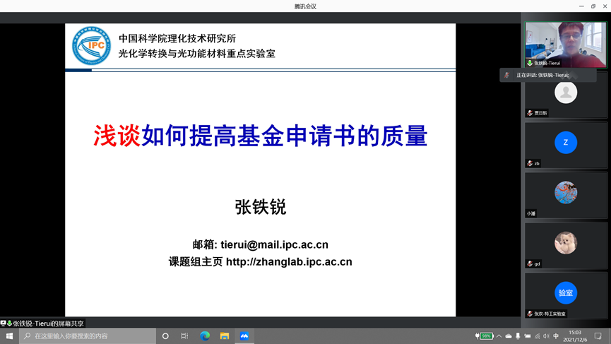 会后,张铁锐研究员在线上与各位老师针对国家自然基金申请书撰写中的实际问题进行了深入探讨。提出提高自身科研能力,提高基金创新性成果是关键,同时也明确表示青年教师要多与外界交流、走出去,提高自身在相关领域的学术影响力。