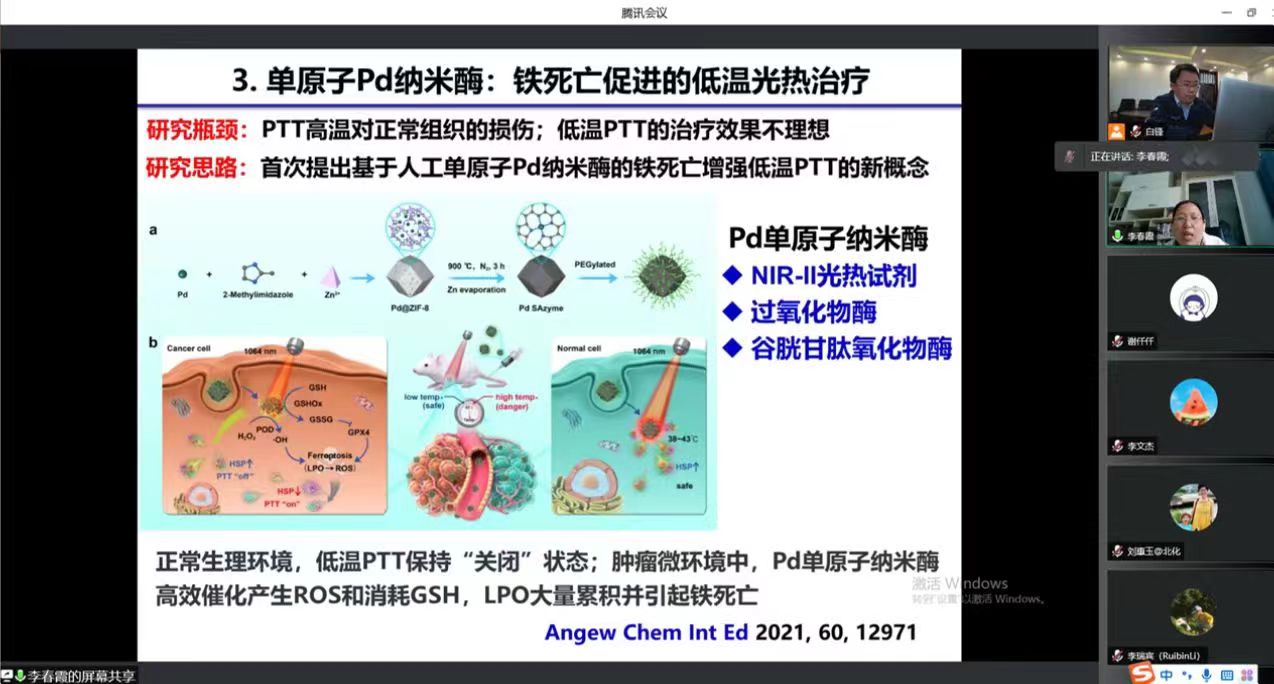 山东大学前沿交叉科学青岛研究院李春霞教授作的报告以《光功能纳米复合材料的构建与生物应用》为题,详细介绍了传统抗癌药物中存在的主要问题和研究瓶颈,针对PTT高温对正常组织会造成损伤和低温PTT治疗效果不理想问题,她的团队首次提出基于人工单原子Pd纳米酶的铁死亡增强低温PTT的新概念。