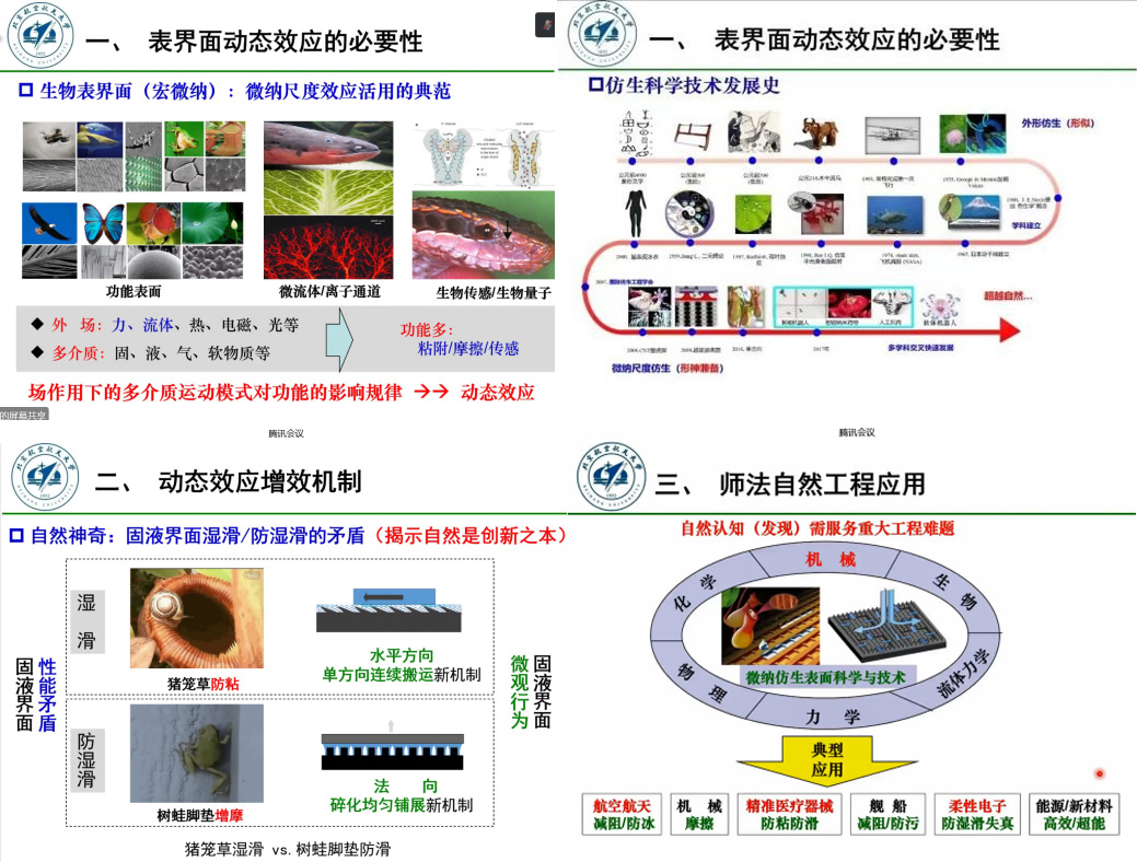 本次会议,陈华伟教授以“微纳仿生表界面动态效应机制及其应用”为主题进行介绍,从表界面动态效应的必要性、动态效应增效机制、应用等方面展开,谈到了目前仿生界面设计和制造的趋势,并表示自然进化是向更省能、更高效的方向进行的,自然界生物可以作为人类创新活动的借鉴对象,例如:猪笼草、树蛙等。猪笼草的特殊微纳结构可以引起液膜高速传输,由此制备了具有逆重力、超高速收集/传输功能的多级结构等。树蛙脚掌的微纳多级结构形成了独特界面液膜调控作用,具有优异的防湿滑特性,根据这一特性,提出了纳米膜版辅助光刻、纳米颗粒自组装、毛细吸附填充成型以及二次光刻复制的办法,实现了多级仿生表面的制备。