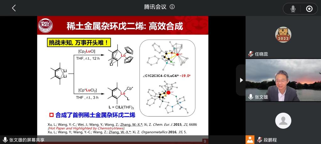 在本次报告中,张文雄教授从稀土元素出发,主要介绍了首例稀土金属杂环戊二烯、稀土杂环丙烯、桥联双卡宾钪和钐以及(N2)3--双钪杂环的合成和结构表征。在此基础上,张教授向我们讲述了如何实现从白磷和氮气出发直接构建有机膦和含氮有机化合物。报告从多角度阐述了对稀土金属有机杂环化学的研究,为我国稀土资源的综合利用提供了有效途径。